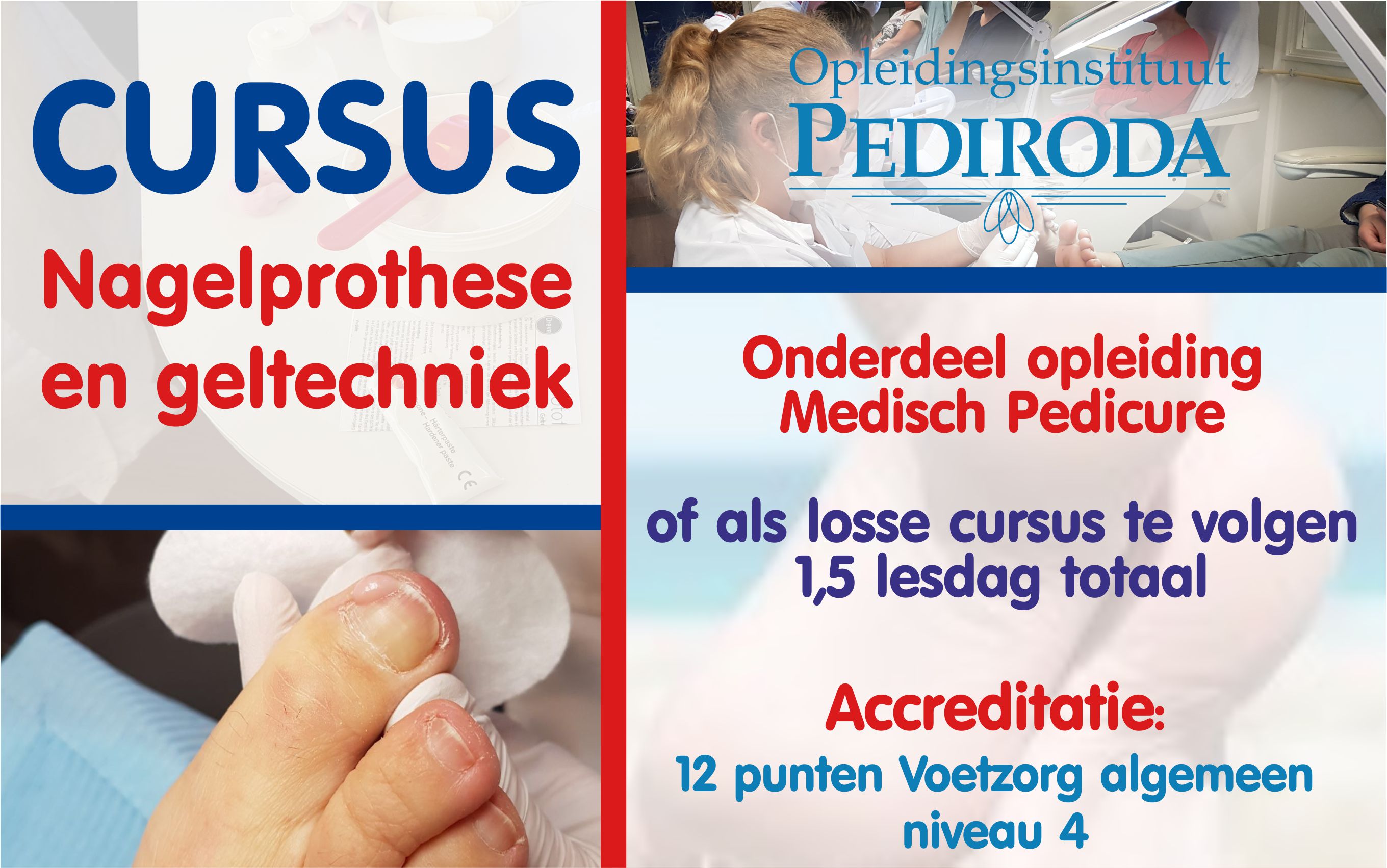De cursus nagelreparatie (prothese) kan een grote aanvulling zijn op uw diploma pedicure. Met deze techniek is het mogelijk om afwijkende groei van nagels te corrigeren of te repareren met behulp van acryl EN gel. Meer informatie over de cursus Nagelprothese en geltechniek via deze link.