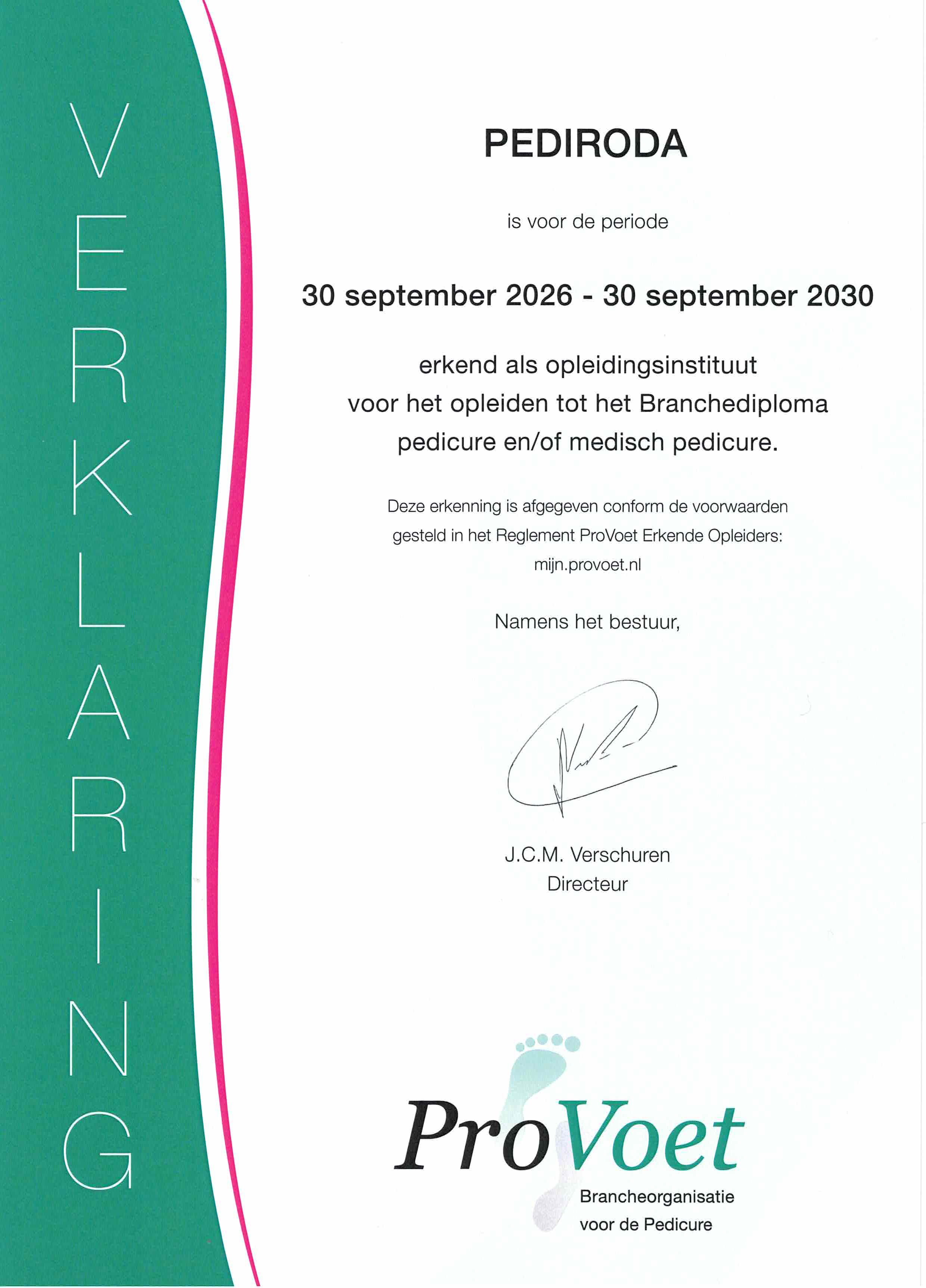 Pediroda is officieel erkend door de Brancheorganisatie PROVOET en door de Stichting BRAVO. Tevens zijn wij lid van het VOUV; de vereniging van particuliere KWALITEITSscholen in uiterlijke verzorging- en voetenbranche. Pediroda is verkozen tot beste pedicure opleider van Nederland. Pediroda is meerdere keren verkozen tot beste pedicure opleider van Nederland! Pediroda.